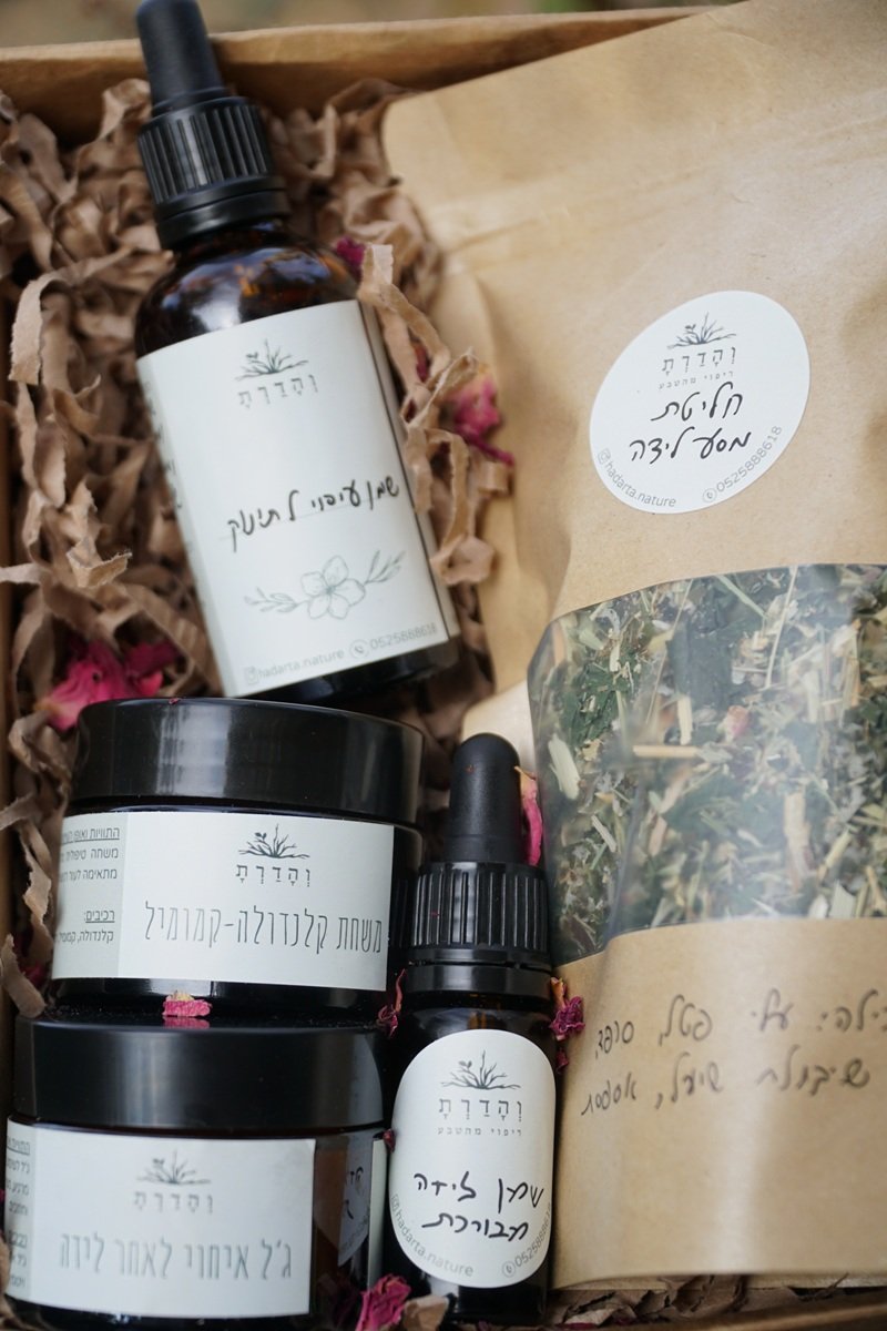 ערכה לתמיכת מסע הלידה ולאחריה, המתנה המושלמת לאם ולתינוק. מכילה: שמן מסע לידה, חליטת מסע לידה, ג'ל החלמה לאחר לידה, משחת קלנדולה קמומיל ושמן עיסוי לתינוק. מוזמנות ליצור קשר להתאמה אישית של הערכה